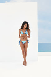 Discover our best-selling triangle top in the latest Blue Terry stretch fabric, offering a chic navy and baby blue reversible design. With interchangeable bra straps and a comfortable stretchy fit for all bust sizes, this timeless piece gives you multiple looks in one incredible top.